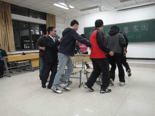 晚上7点整,班会在班级几位新同学的自我介绍中拉开帷幕。随后,班会进入紧张的游戏环节,游戏环节由“猜谜语”“抢凳子”“同心结”三个小游戏组成,游戏过程中还穿插以同学们的即兴表演。其中,在抢凳子环节中,李成刚老师更是主动参与到游戏中来,与同学们一起游戏,期间同学们的各种舞蹈表演更是将班会气氛推向了高潮。“同心结”游戏则以八个人为一组,小组成员紧紧挨在一起,每个人都分别握住对面两个人的手,在最短时间内站开成一个圈的小组获得胜利。游戏中,每个小组都展现了良好的默契程度。最终,班会在辅导员李成刚老师的点评中圆满结束。