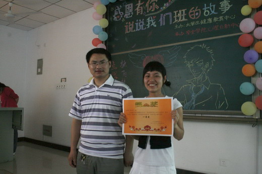 心理健康自助中心指导教师李秀老师对本次比赛进行精彩的点评并对“感恩有你”活动主题进行深刻的诠释:“感恩有你”的“你”既是我们每个人自己,又是身边的朋友、同学,更是班级这个大家庭,正是因为这些,我们的生活才如此的丰富多彩。最后,主持人当场公布了比赛成绩并由评委颁奖。地质09-1班荣获一等奖,消防09-1班与英语09-6班获二等奖,安全09-1班与科技09-1班获三等奖,数学08-3班、过控09-2班、交运09-2班、建筑08-1班、工商09-1班获得鼓励奖,比赛就此圆满结束。通过本次班级风采大赛不仅调动了各参赛班级的创造积极性,而且在提高班级凝聚力的同时,展现了班级积极向上的风貌,为塑造一个健康向上、感恩有爱的校园提供了美好的机会。