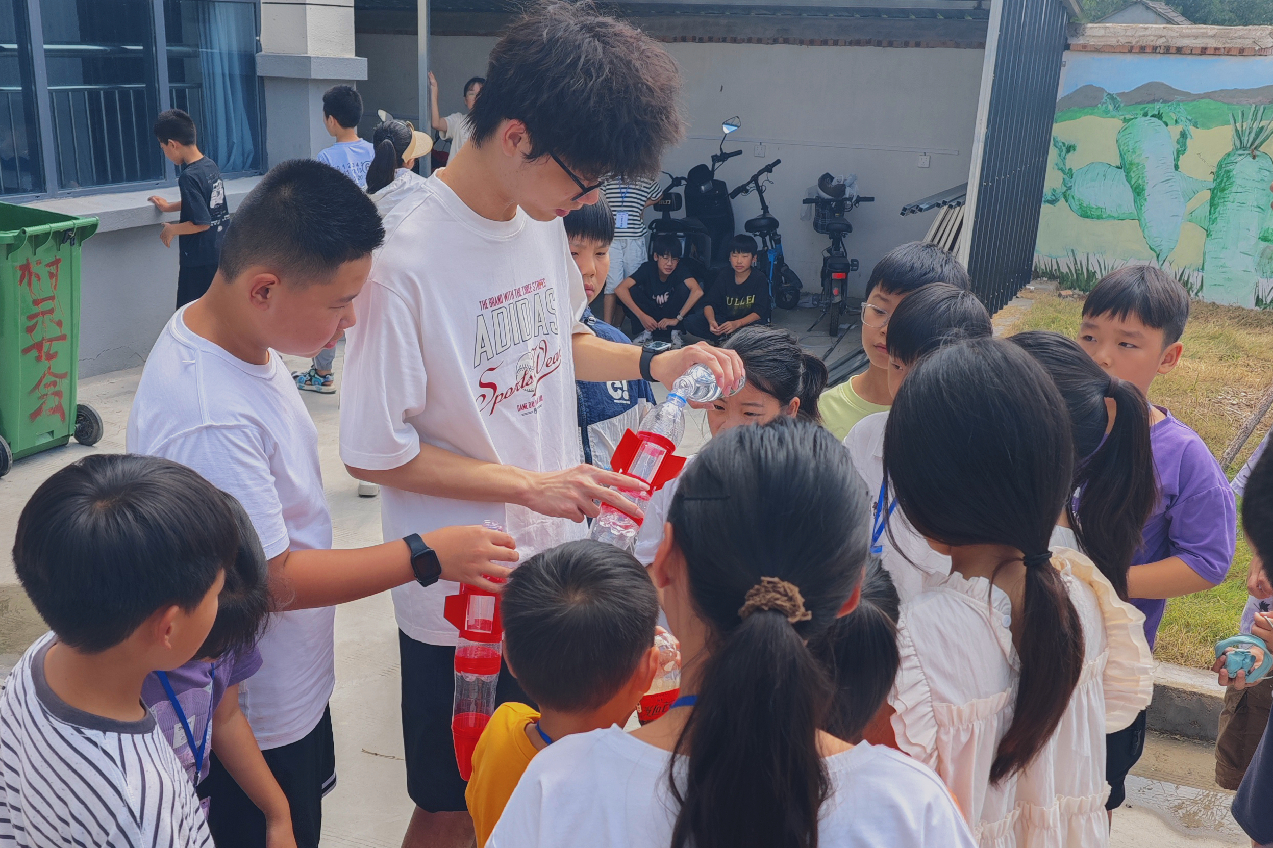支教首周,志愿者们通过趣味互动游戏与孩子们迅速建立信任与情感连接。在日常教学中,团队成员针对不同年级学生的知识短板,开展个性化课业辅导,帮助其夯实基础。第一周开展了丰富多彩的特色课程:消防安全课结合乡村居住环境,借助真实案例讲解火灾预防与逃生技能,让孩子们在具体场景中树立安全意识;地理课引导孩子们鉴赏自然风光,生物课探索人体“八大系统”,拓宽了他们的知识视野;情景演绎课通过扮演“危险先生”,让孩子们沉浸式识别生活中的安全隐患,学会规避风险。第二周,队员季晨彦主讲“水火箭”制作课,孩子们积极动手、踊跃提问,在实践中直观感受物理知识的魅力。杨博远带来漆扇文化课程,讲解了漆扇的历史与文化价值,并指导孩子们亲手绘制专属漆扇,留下一份独特的非遗记忆。此外,实践团还开展了防拐卖、电气防火、防溺水等系列安全科普教育,全面护航儿童成长。