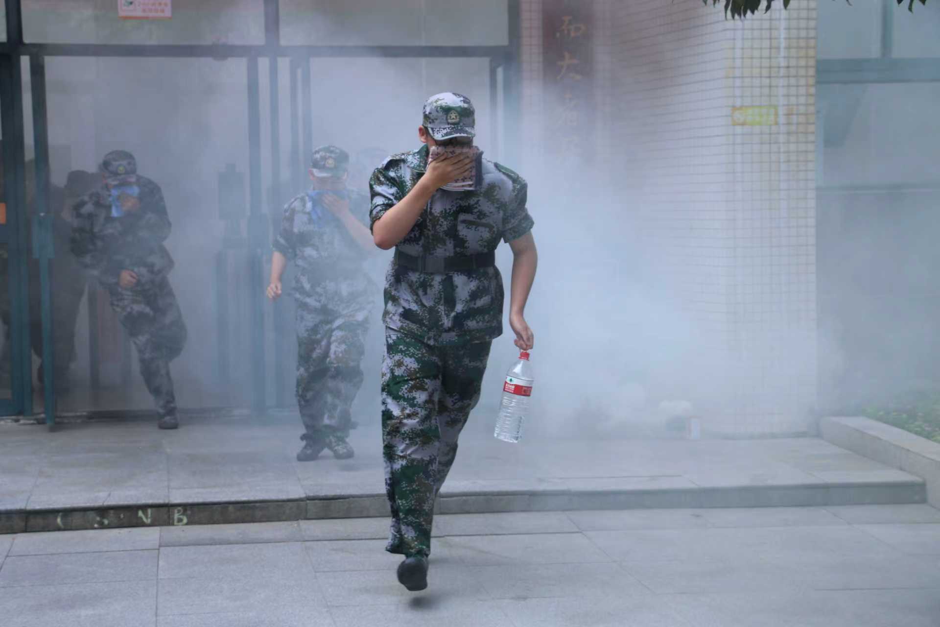 随着急促的警报声骤然响起,全体新生迅速进入紧急响应状态。在执勤教师和学生干部的有序引导下,参演学生严格遵循疏散要求,用湿毛巾掩捂口鼻,低姿弯腰,沿着指定安全通道快速、有序撤离宿舍区域。根据预案部署,天美传媒