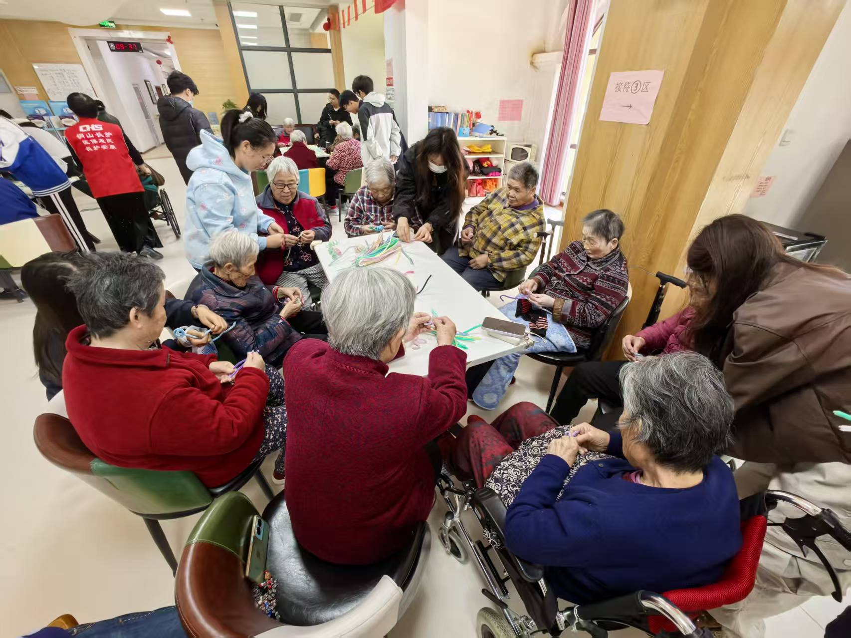 活动以手工制作与康复游戏为主。志愿者们组织老人开展扭扭棒手工制作,在志愿者的协助下,老人们逐步完成各类造型作品,现场氛围温馨融洽。针对部分行动不便的老人,志愿者专门设计了坐式传球等互动游戏,帮助老人活动肢体、促进康复,在轻松愉快的氛围中增进交流。