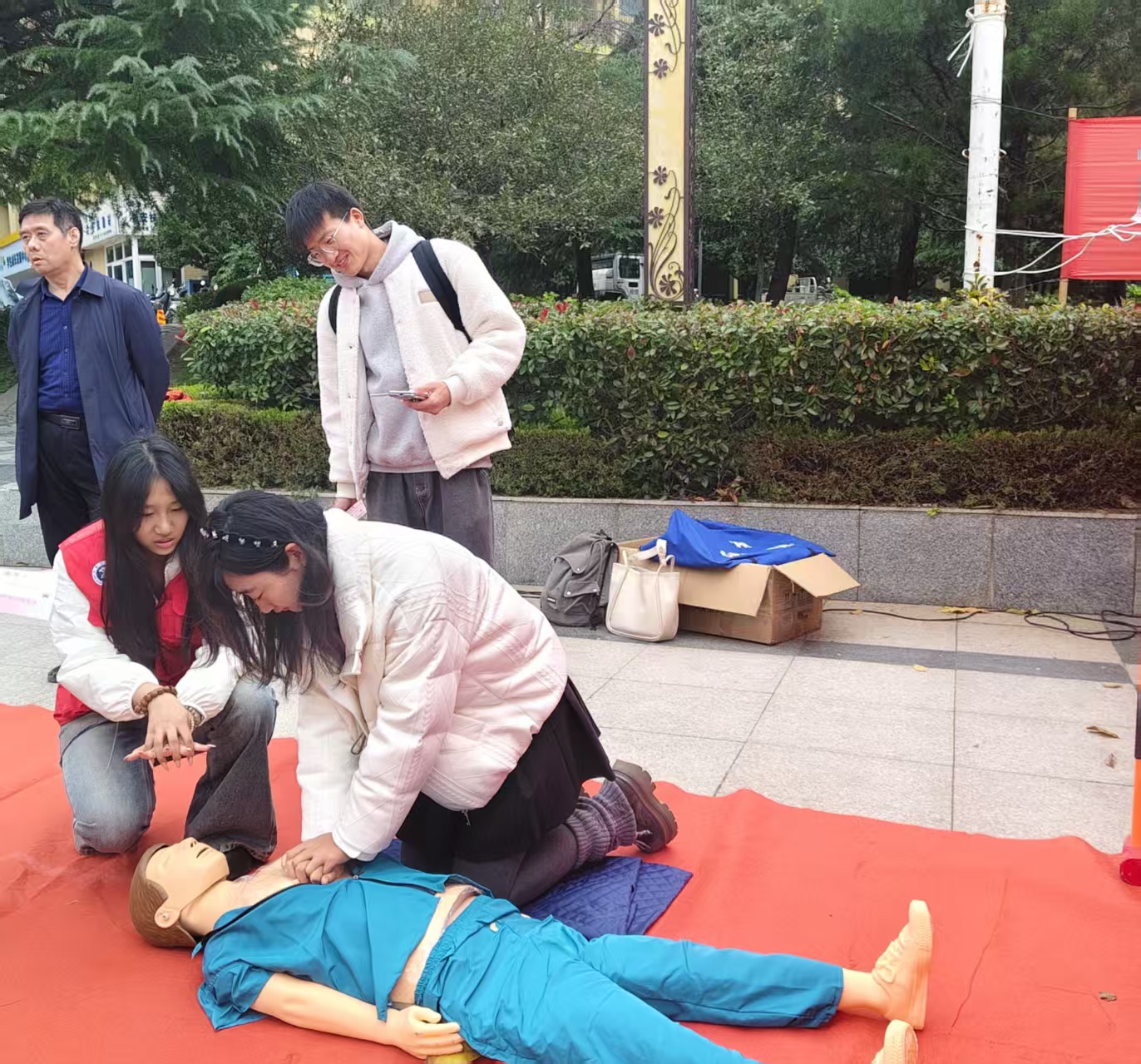 活动现场设置了多个功能明晰的互动体验区,涵盖知识科普、技能实操和情景模拟等环节。消防知识科普区通过展板与手册向师生系统介绍消防安全常识;火灾逃生体验区模拟真实火场烟雾环境,指导参与者掌握低姿防护、有序疏散等关键方法;心肺复苏体验区由专业人员演示并指导胸外按压、人工呼吸等急救技能;灭火实操区在消防员指导下,师生轮流使用灭火器进行模拟火情扑救训练;水带保保龄球区则以趣味方式帮助师生熟悉水带展开与投掷技巧;消防知识竞答与飞行棋体验区则通过轻松有趣的互动形式,巩固消防知识学习成效。