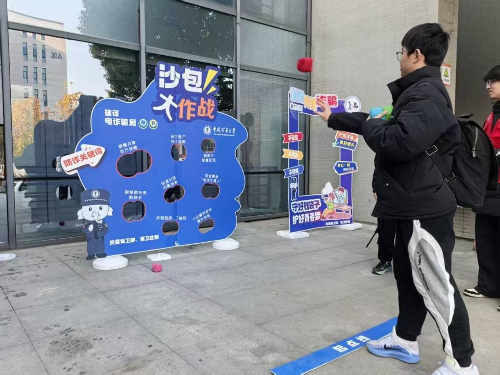现场设置“反诈科普”“反诈能力测试”“玩套圈·防圈套”“反诈沙包大作战”等多个互动区域。在“反诈沙包大作战”区,学生通过投掷沙包识别诈骗关键词,在游戏中加深对诈骗手法的认知;“反诈科普”展板前,志愿者为同学们讲解常见诈骗类型与防范技巧;趣味拍照框吸引不少同学打卡留念,大家手持“不轻信、不转账”等宣传板合影,在轻松氛围中传递反诈理念。活动还为参与者准备了反诈主题文创纪念品,延伸宣传效果,融入日常生活。