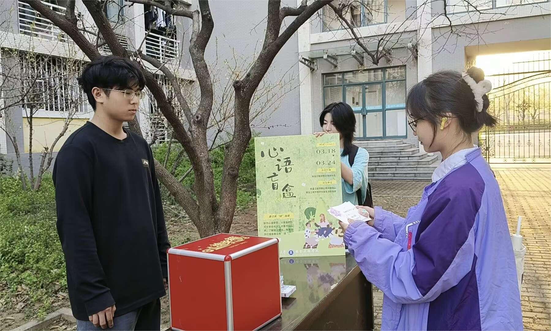活动前期,同学们领取到主办部门提前准备好的空白明信片,写下安慰和鼓励的暖心话语,绘画上装饰的图案,精心地制作好心语便签,并投入盲盒中。活动中期,同学们来到梅三天井,写下自己的焦虑或烦恼,并从盲盒中抽取一张便签作为回应。同学们通过盲盒交换的形式,在了解他人想法的同时,也将内心的心声分享给他人,互相激励和成长,共同克服内心的负面情绪。活动后期,主办部门对参与者的作品进行评比,并设立奖项,分发奖励,以鼓励同学们更勇敢地直面内心的情绪。