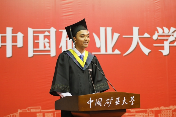 2017级本科生艾克热木江·艾合麦提作为本科生代表进行发言,艾克热木江·艾合麦提同学分享了自己从新疆来到矿大求学的经历,介绍了自己学习安全专业的初衷与使命以及选择加入研究生支教团的感悟。毕业典礼上,也为天美传媒