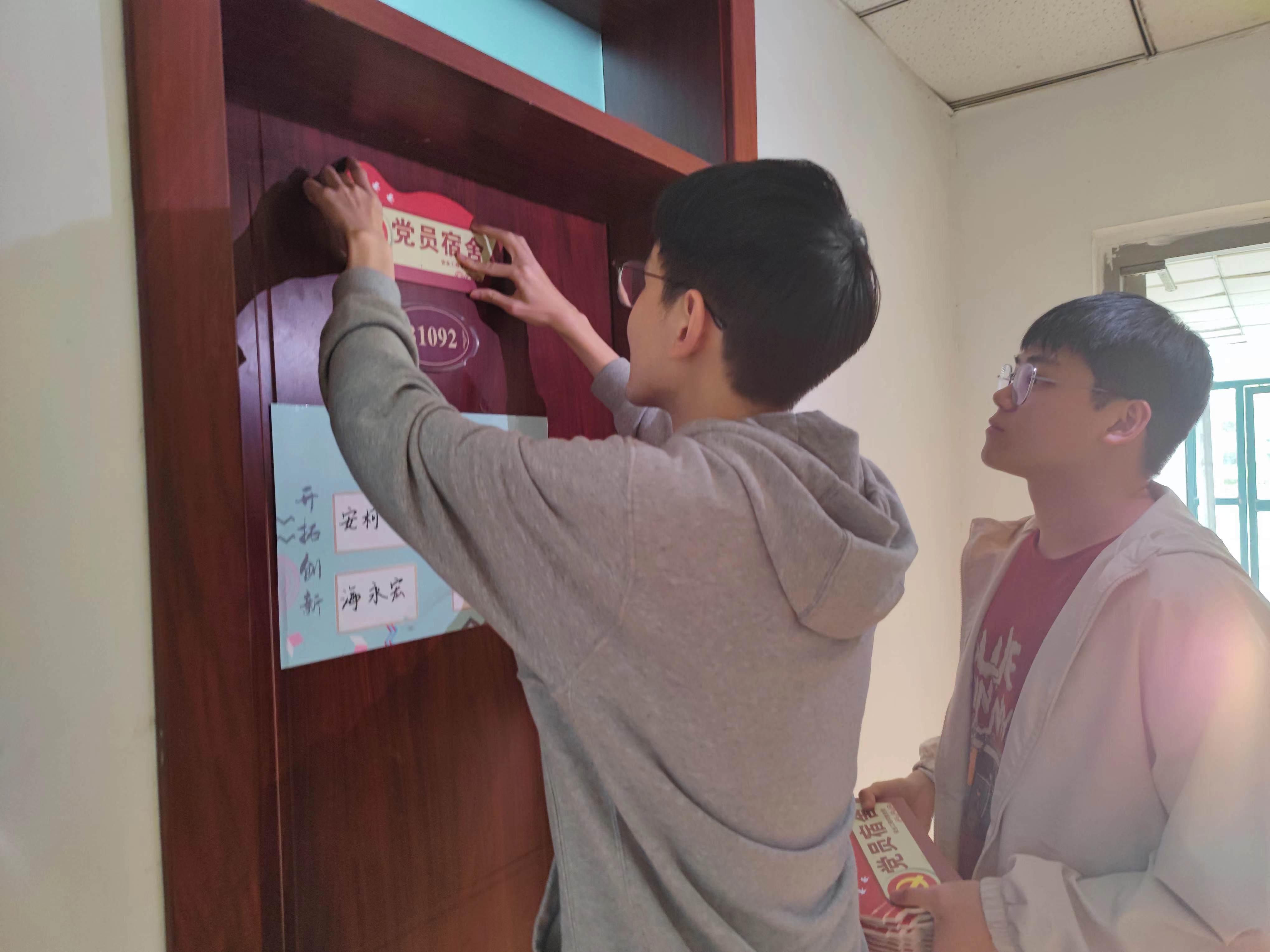 学生党员工作站组织学生党员为新发展的预备党员所在宿舍粘贴铭牌,并与预备党员展开交流,了解宿舍情况。