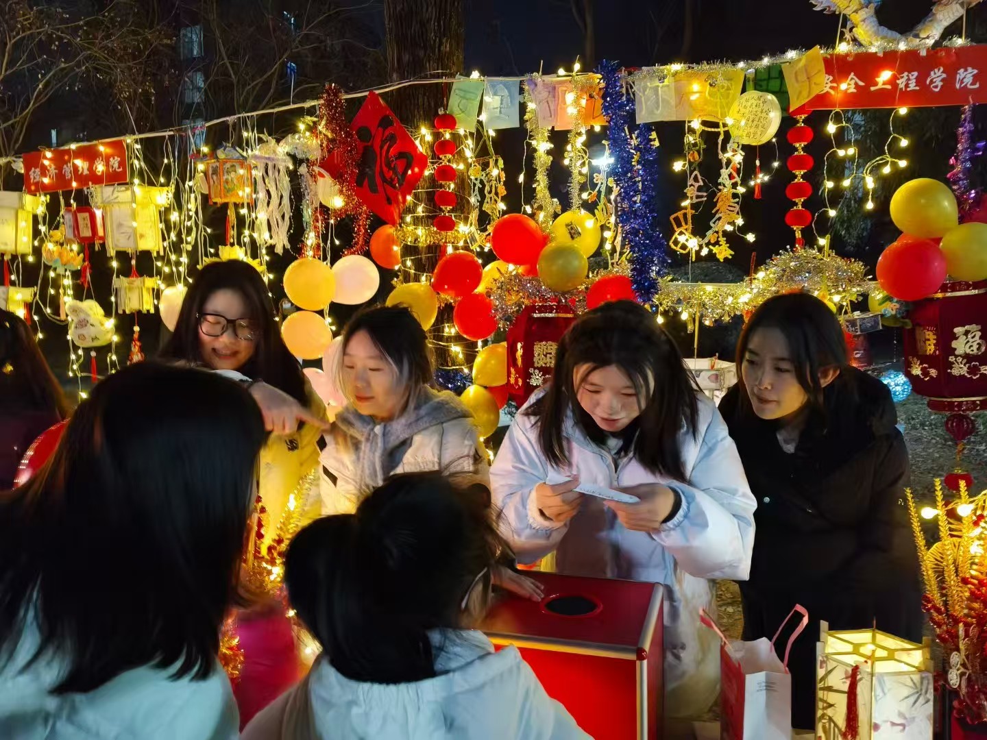活动当天上午,志愿者们便早早来到场地,有条不紊地进行布置。气球、彩带、剪纸等装饰品将现场装点得年味十足,洋溢着喜庆的氛围。灯展现场,天美传媒