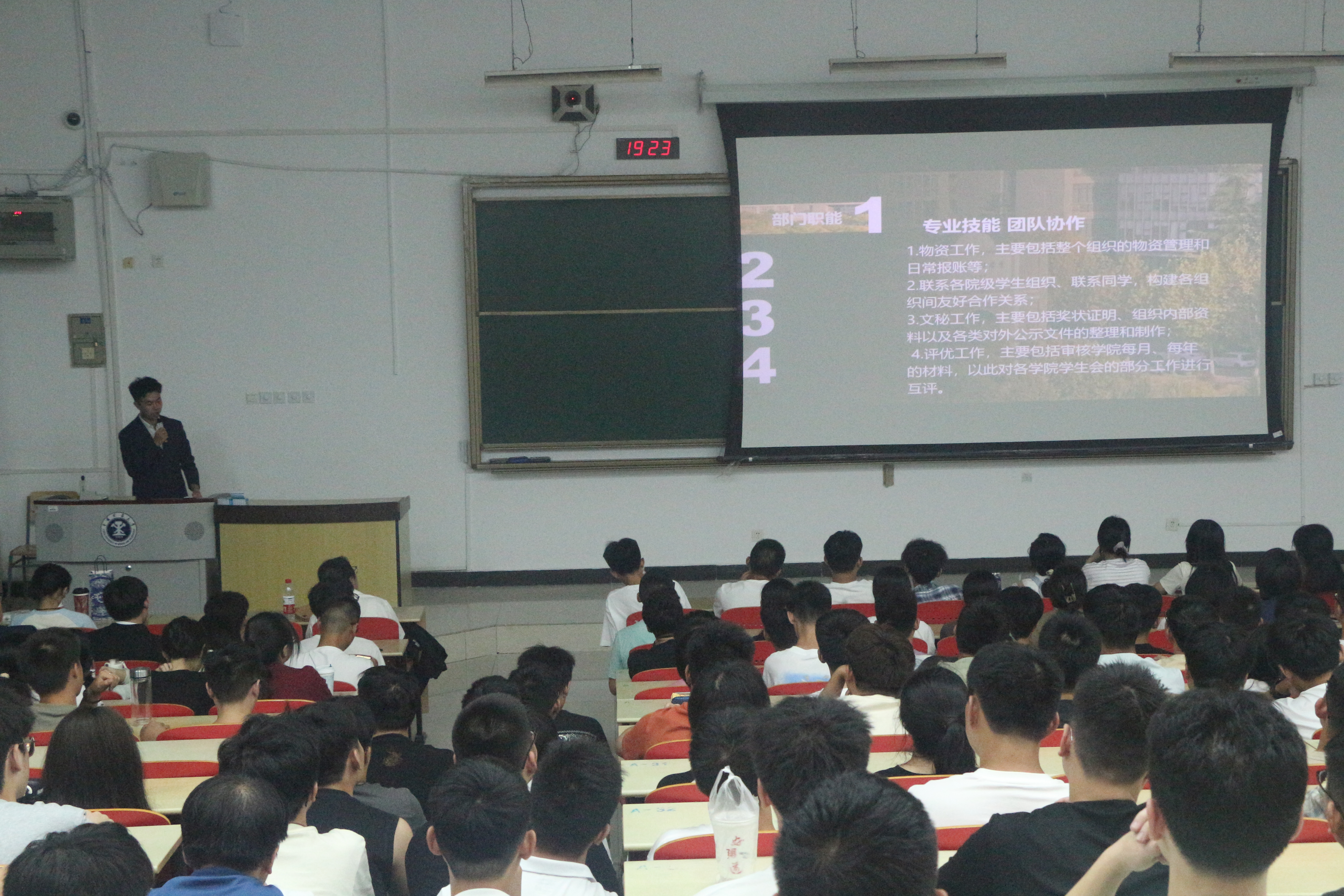 第十八届团委学生会主席团成员首先介绍了学生会的发展历程、组织架构以及各部门的主要职能,并分享了过去一年中所取得的成绩与经验。随后,各部门负责人依次上台,通过PPT展示和现场互动的方式,详细讲解了各自部门的工作特色和发展方向,鼓励同学们根据个人兴趣和特长选择合适的部门加入。