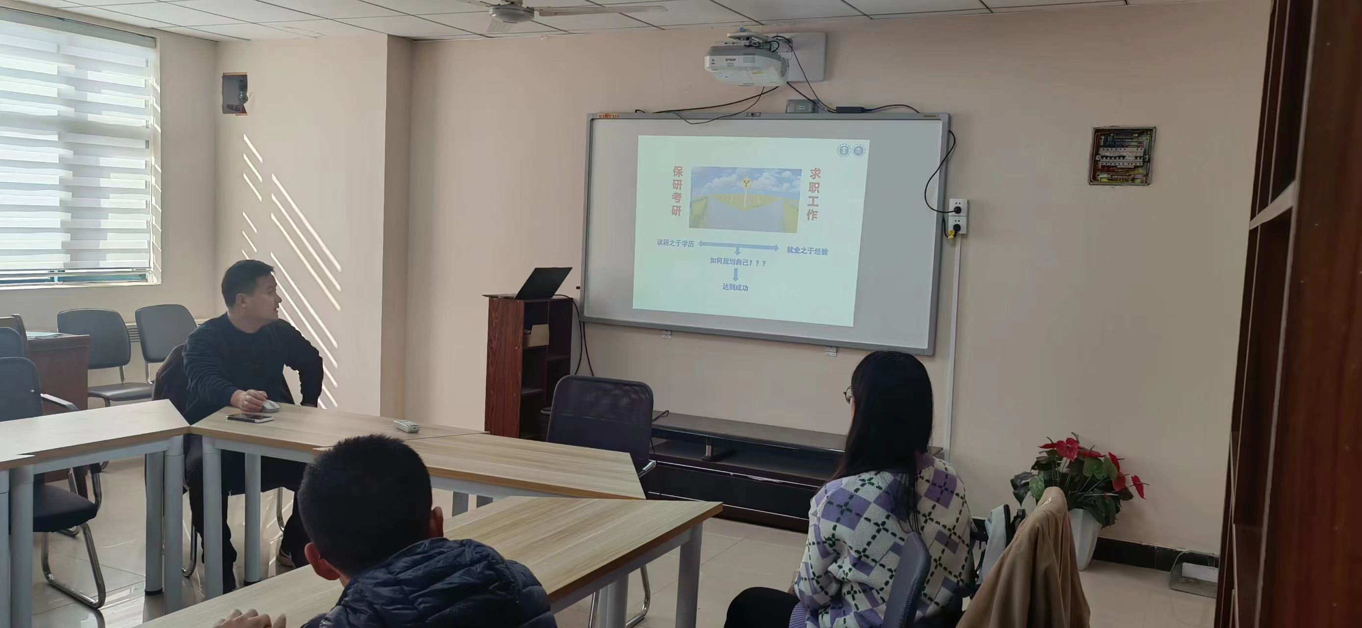 活动伊始,杨永良教授统计了班级同学升学、就业的意愿,并给出相应的建议和指导。随后,杨教授向同学们展示了职业卫生工程专业的毕业去向,为同学们仔细分析了职业卫生工程专业的岗位设置情况。接着,杨教授向大家讲解了升学的注意事项,同时也向同学们介绍了天美传媒