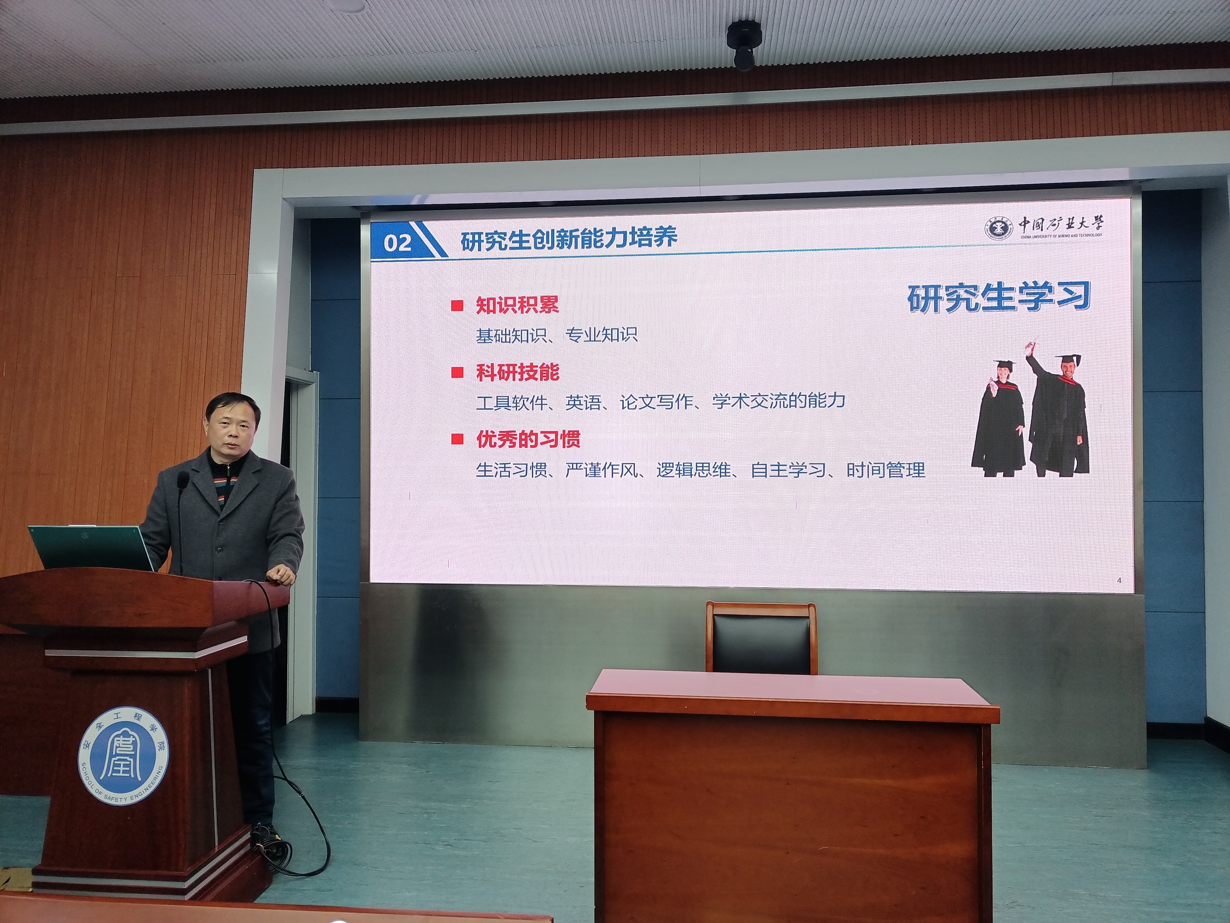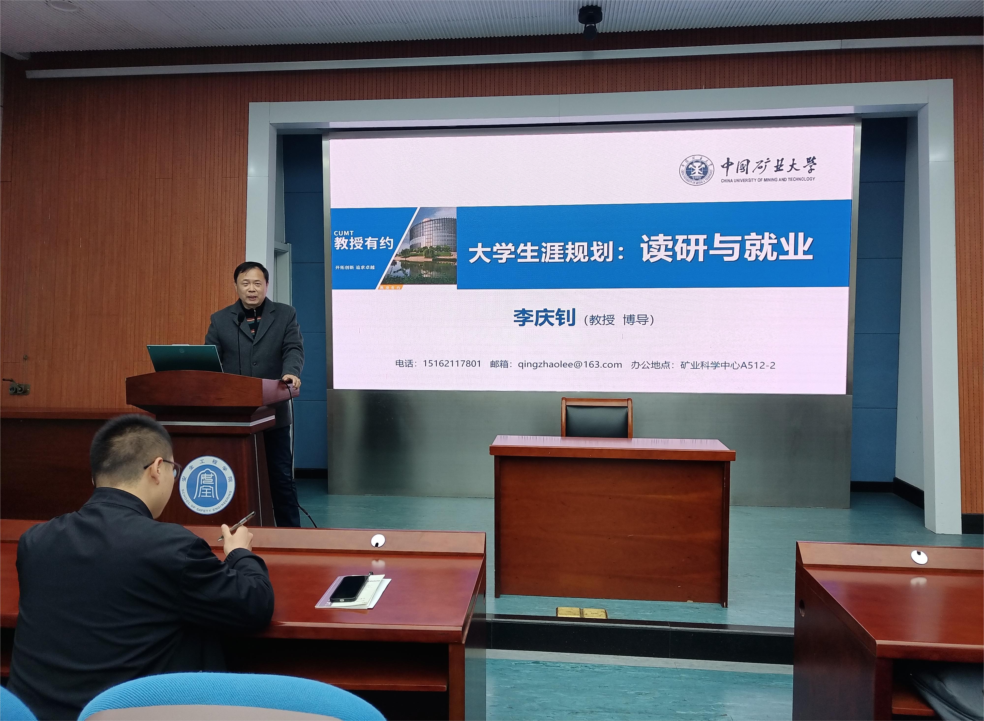 于矿科A200开展“读研与就业”主题讲座。李庆钊教授受邀主讲,2022级安全三班行政班主任邵振鲁及全体成员参加本次活动。