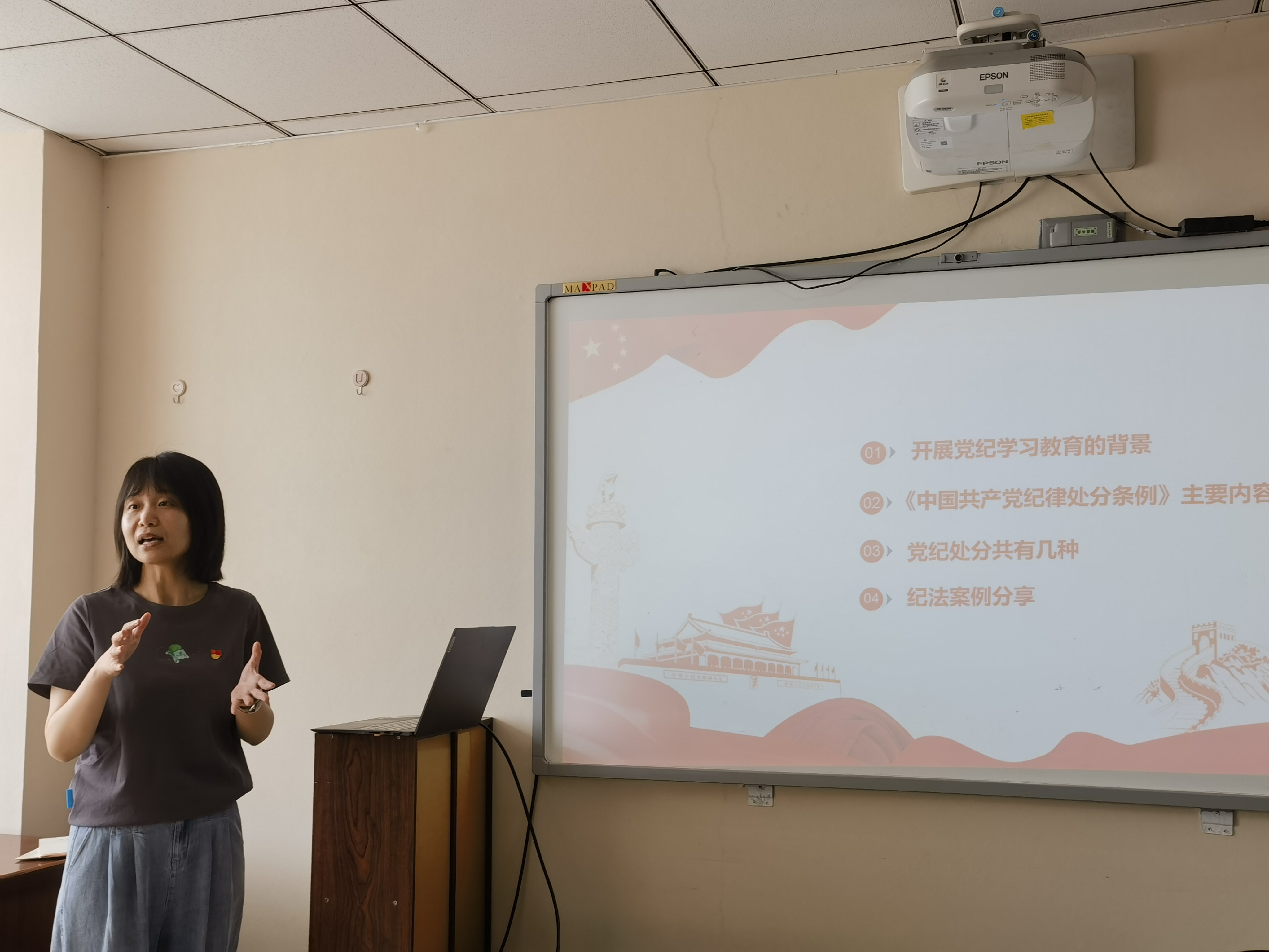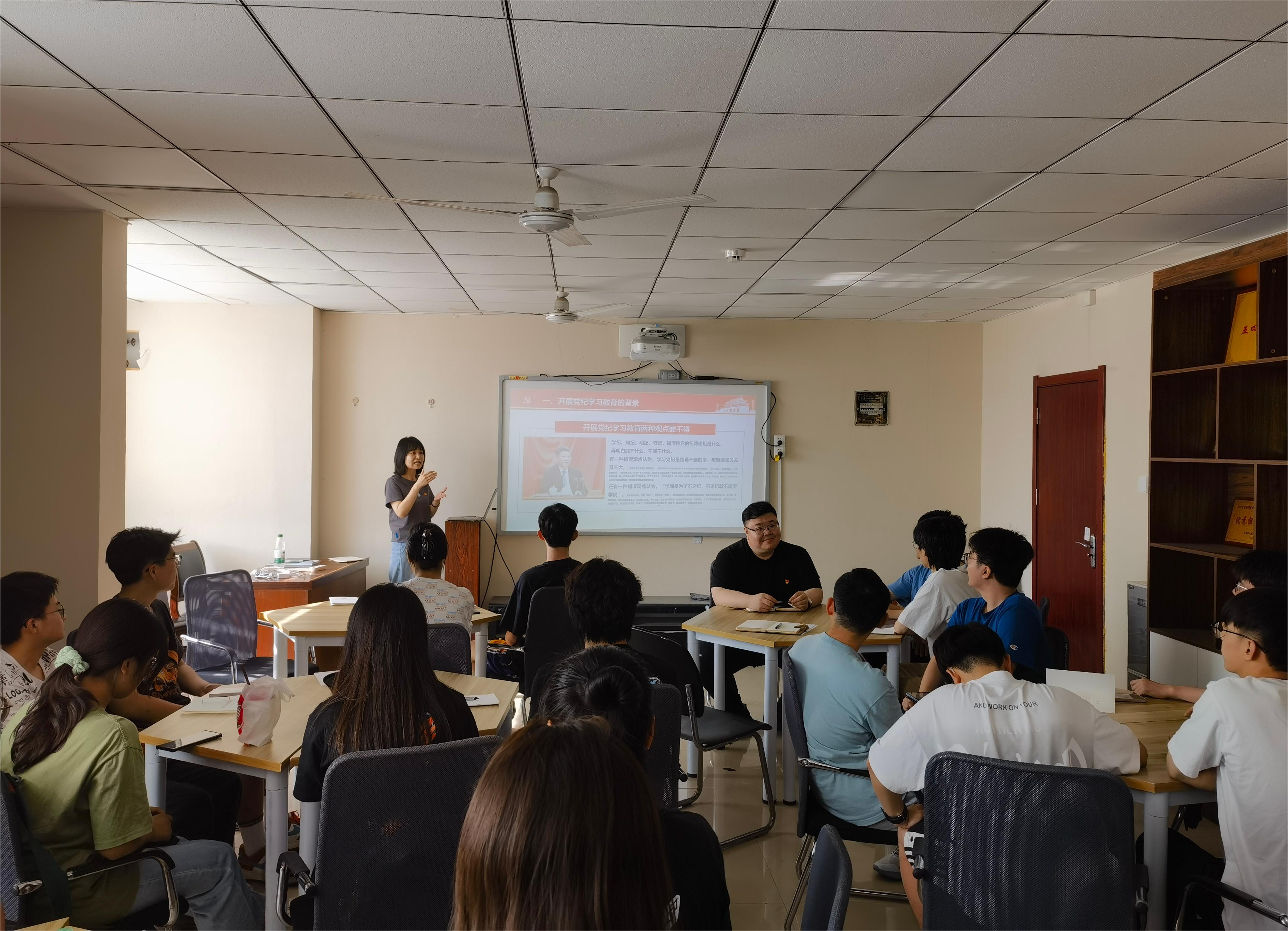 活动伊始,支部书记郭佳强调了党纪学习对于强化党员思想教育的重要作用。她从党纪学习教育背景、《中国共产党纪律处分条例》主要内容、党纪处分种类和纪法案例分享四个方面展开讲解,明确了党员同志“学纪、知纪、明纪、守纪”和纪律学习的目标要求,鼓励大家将纪律学习融入日常,学用结合。接着,郭佳老师讲解了《中国共产党纪律处分条例》的历史和修订内容的差异,让同学们对其发展有了更深刻的理解。活动最后,郭佳老师放映了简短的党纪教育动画,富有趣味性的同时也引发了同学们的深思。