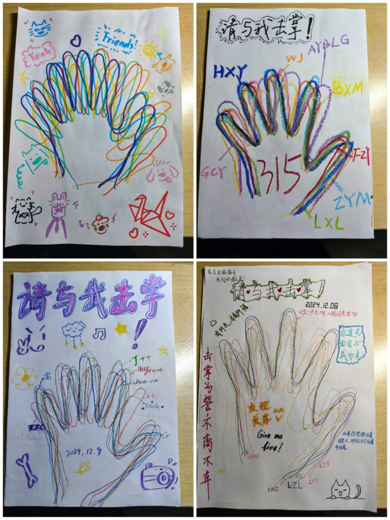 官方QQ平台广泛宣传活动,成功吸引了学生的广泛关注。活动期间共有超过50名学生积极报名参与。参加活动的学生们以8至16人为一组,自备A4纸张和彩色笔,在纸上描绘出自己的手掌轮廓,并留下姓名或昵称以及个人寄语。每个小组选举了一名组长,负责组织协调工作。活动结束后,评审团队依据既定标准对作品进行了评选。