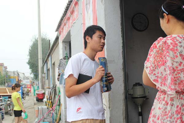 三食堂广场,队长杜杨强调说:“此次活动,我们要以热情的态度去邀请村民们参与到我们的知识竞赛活动中来,通过这种活动激发他们读书的兴趣,最终实现全民阅读。”9点半,队员们到达葛楼社区。为了提高效率,队长杜杨把队员们分成两个小组,每组带上已经制定好的游戏规则,去向村民介绍此次活动。此次活动分为两个诗词背诵和短文朗诵两个部分,参与活动者均可获得书籍一本。后勤部部长潘荣亮带领的A队来到街道上,他沿家询问,态度亲切友好。其中,他来到一家卖东西的小商店,他先详细的给店主介绍了游戏规则,店主听后很积极,表示愿意参与,队员们让他朗读了一篇散文,他声音洪亮,引得多数村民的围观。队员们趁势向围观的村民们提问诗句,让他们回答下句,村民们踊跃抢答,场面热闹。最终,队员们给参与的村民们发放了书籍,并鼓励大家多读书,提升自身的文化修养。中午十一点,活动在大家的高声欢呼中圆满结束。