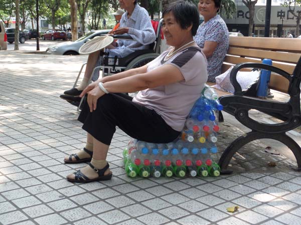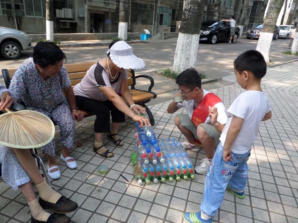 为了充分发挥出宣传的作用,实践团成员随身携带着早已准备好的宣传海报,在小区的宣传栏和小区楼道张贴宣传单的地方将小队制作的海报贴了上去,并在人群密集的地方宣传海报内容,引来了不少人驻足观看。接着,董齐齐同学拿出了事先准备的环保素材――一些废弃的塑料瓶,他用这些塑料瓶固定成了特有的形状,他希望能够与社区居民共同制作成一个“塑料瓶椅子”,以此来唤起人们对废弃物循环利用的意识,减少废弃物污染问题。活动一开始,便吸引了很多社区居民的围观,他们对这个即将完成的“椅子”充满了好奇,也非常想知道这个方法的实用性到底如何。在众多的围观人群中,董齐齐同学挑选了一位阿姨,他们将共同完成这个塑料椅子。在阿姨的帮助下,塑料椅子成功地完成了。为了验证它的实用性,董齐齐邀请了一位社区居民坐在了“椅子”上,那位居民表示椅子很舒服,非常适合在夏天坐,感觉很凉爽,也很结实。最后,董齐齐同学将完成的塑料椅子送给了与他合作的那位阿姨,并再次向社区居民宣传了废物利用的重要性,很多居民受到了这次活动的鼓舞,表示十分愿意回家将废弃物变废为宝。