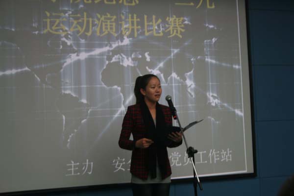 晚上7:00整,安邦站长致辞并宣布比赛开始。参赛选手都准备充分,满怀激情,在或哀伤或优美的音乐中他们诉说着对一二九运动的感受,在一张张幻灯片中他们展现着对一二九运动的理解。其中,安全12-2班的孙勇甚至脱稿演讲;安全12-3班的陶冰冰用她优异的演讲技巧让大家为她的演讲深深折服。听到这样精彩的演讲,台下的观众也时常爆发出热烈的掌声,比赛的气氛逐渐推向了高潮。最终,安全12-2班孙勇和安全12-3班陶冰冰的精彩演讲深深打动了评委和观众,荣获比赛一等奖。