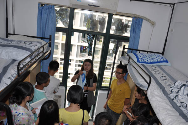 团委在军训前指导14级新生整理内务。9月4日下午3点,辅导员兼书记孙婷、郑文奇、倪炎老师带领团委学生会同学进入宿舍向14级新生讲解内务整理。