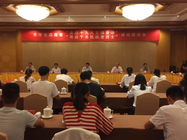 9月8日,省文明办大学生志愿者“喜迎十九大百场宣讲”、“寻访千名抗战老战士”活动座谈会于南京西康宾馆第一会议室隆重举行。江苏省文明办副主任葛莱、江苏省民政厅副厅长刘亚军、共青团江苏省委副书记司勇、南通市委党校副主任施展、南师大抗日研究所王志龙教授、各团队指导老师代表以及青年志愿者代表等一同出席本次会议。