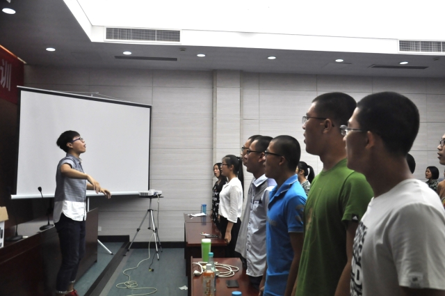 晚上7点,参加合唱的新生准时到达现场。爱艺艺术团的负责人徐刚、李誉廷担任此次红歌比赛的教练。在唱歌之前,教练要求新生们进行发音练习,李誉廷对新生说:“在每一次的排练中,发音训练是必不可少的,这是基础,也是成功的关键。”在教练的指导下,每一个新生都张大了嘴巴,全身心的投入到了训练之中。为了提高训练效率,教练教给了新生一个小诀窍:每个新生都从座位上站了起来,跟着教练的动作,一边挥舞胳膊,一边发出凝聚而短促的声音,洪亮的声音萦绕在会议室中。在发音训练结束后开始进行演唱练习,每次演唱后,教练都会指出其中问题所在,同学们认真的跟随指挥进行一次又一次的发声,和声,演唱练习。为了解决新生跟不上演唱节奏的问题,指导老师带领大家在合唱的过程中用拳击掌找准节奏,并要求同学们在一次次的演唱中加以改正。红歌激昂,新生们的热情也十分高涨,一个个都积极配合,态度认真。