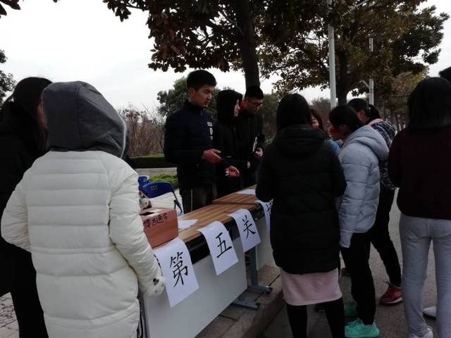 南湖校区行健路为比赛线路,以图书馆作为比赛起点,进行长约6km的趣味马拉松比赛。参赛选手以4人一组进行参赛,本次比赛有40支队伍参加比赛,由于天气严寒,开跑前所有参赛选手都进行了充分的热身准备,选手们在裁判的号令下一同起跑。在图书馆设立的大本营,作为签到地点和一个供水点;在行健路上每隔四百三十米有一个关卡,共设六个关卡。每组选手在行进的过程中,可以向任何一个关卡发起冲击或者补充水分。6个关卡分为两个理论学习类试题关卡,2个活动类关卡,1个体育竞技类试题关卡,1个英语类试题关卡,以及1个艺术类试题关卡,每个关卡设有若干题,选手们通过答题获得分数,最终以答题分数和所用时间为标准对每支队伍进行排名。