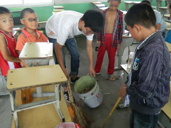8月7日下午,“爱心阳光之队”支教团的志愿者们带领参加支教的同学一同进行大扫除活动。负责各个年级的志愿者们带领自己年级的同学展开打扫任务,大家分工明确,井然有序,仅用半个小时就完成了大扫除任务。