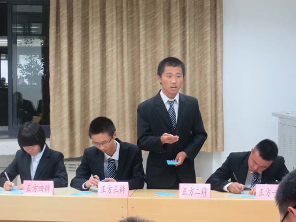 首先阐述了自己的观点,并结合了许多法律文件来支持本方观点。反方一辩随即对正方观点进行了总结,并条理清晰地阐述了自己的观点。随后的提问驳斥环节中,正方和反方都依据对方在立论上的陈词进行了激烈的驳斥,但很明显,在这一环节中,正方抓住了反方阐述中的一些漏洞进行了反击,并要求反方正面回答。尽管反方也进行了发问,但是正方三辩提出的问题逻辑性很强,将反方二辩的思路完全带了过来。自由辩论随即进入了白热化阶段,辩手们唇枪舌剑的攻势,字字力争,句句紧扣,将整场的赛事推上了高潮,赢得了现场观众的阵阵掌声。最终,正方以一票之差惜败给了反方。