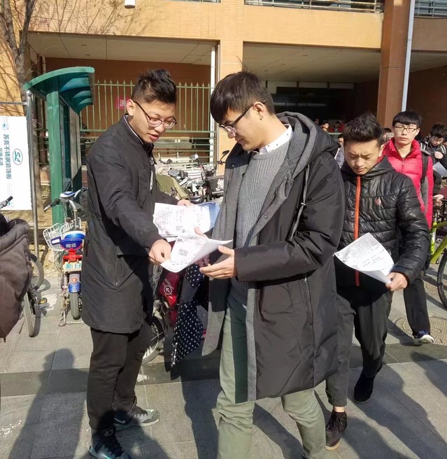 中午12点,尽管当天寒风阵阵,实践部部长与干事们早早到了现场,完成所有准备工作。宣传活动正式开始,实践部成员们积极主动地向来往的同学分发传单,并详细讲解活动的相关情况,包括活动形式、内容与报名方式。同学们纷纷停下脚步,并仔细地了解活动。天气虽冷,但同学们参加活动的热情十分高涨,纷纷填写报名表。同时,本次活动的报名会在网络上进行。