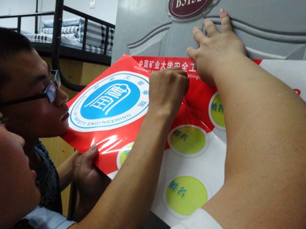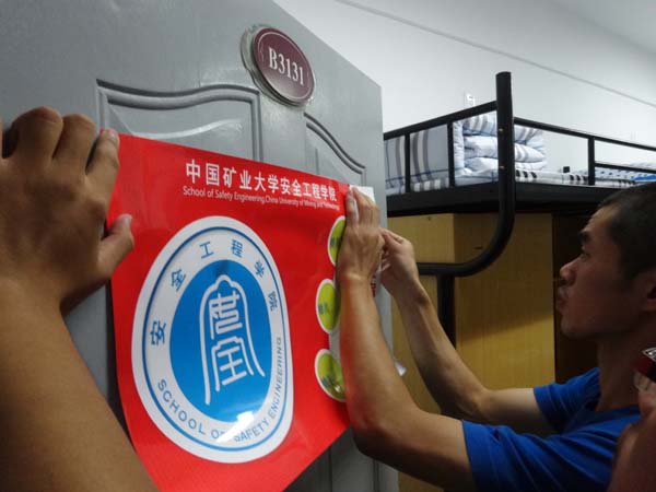 最终,在学长的指导下,13级新生通过认真、仔细地进在自己宿舍进行新门牌的张贴。门贴更换于当天晚上10:00全部更换完成。