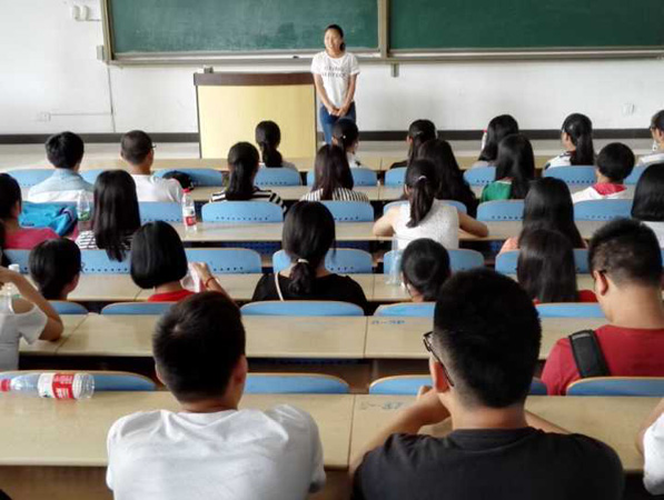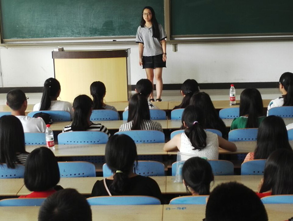辅导员吴张蔚老师和团委学生会文艺部部长担任评委,15级新生上台进行即兴展示。