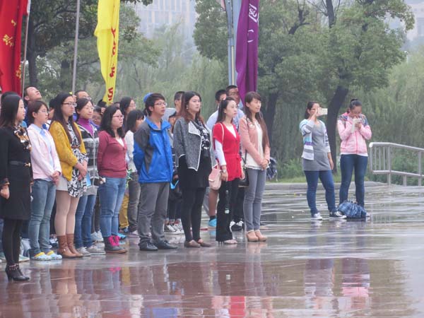 新生在孙婷老师的带领下冒着清晨蒙蒙的细雨参加了“伟大复兴路,共圆中国梦”庆祝中华人民共和国成立65周年升旗仪式暨成人宣誓仪式。天美传媒