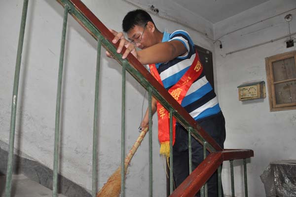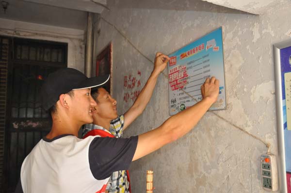 此次打扫卫生主要是清理小区内的小广告以及公寓楼道内的垃圾。下午三点,在安排完任务后,所有人分成四组打扫卫生。他们每人配备一把扫帚,每组由一个指导老师带领打扫卫生。他们逐个公寓楼,逐个楼层打扫,公寓楼道里虽然阴暗,还有蚊虫叮咬,但是他们不曾说累,楼外面,虽然烈日炎炎,他们擦干额头上的汗,喝口水,继续干活。