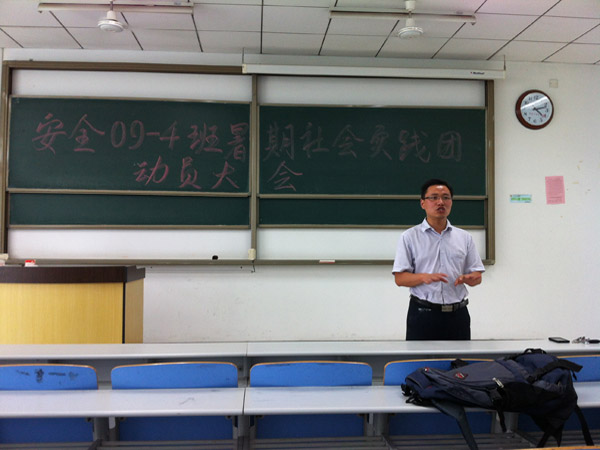 安全09-4班组成的“安全保煤矿和谐发展,行动迎十八大”暑期社会实践团在南湖校区公教四楼B206召开了实践团动员大会。团队指导老师唐俊出席此次动员大会,会议由团队队长涂庆毅主持。