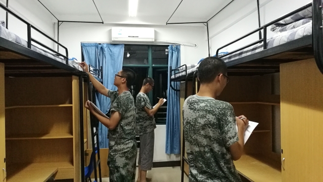 下午集训结束后,辅导员孙留涛重新强调了军训内务整理细节,分配安排近期工作,提出“新要求,高标准,有效率”的理念,并要求晚上各个寝室对细节部分进行互查打分。晚上9点,内务互评准时开始。各个寝室经过认真仔细的检查,进行了记录打分。同学们重视和配合检查工作,主动细致地记录不足,并及时询问团委学生会解决方案,力求把细节做到完美。