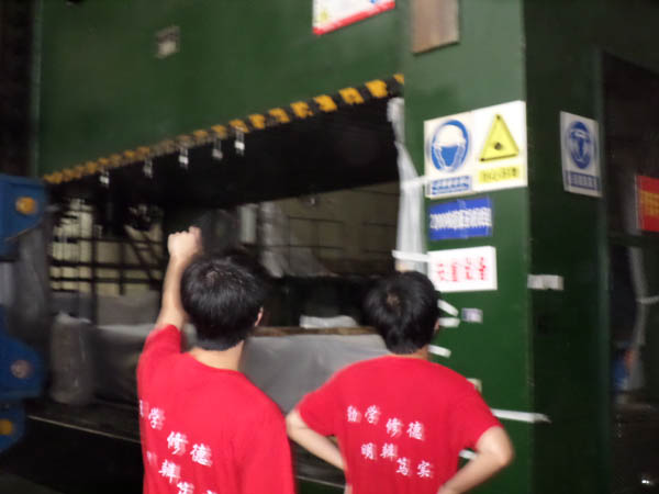 实践团走进生产车间后发现,偌大的车间内各种各样大型设备正在紧致有序地运行着。而实践团成员们今天的实践任务,就是着手操作车部件的轧制。车部件轧制由两个人和轧制车床来完成,通过将初期模具搬运到轧制车床上面之后,在激光传感器的引导下校正模具位置,在两边相对位置的工作人员同时按下启动按钮,来确保轧制的完成。此处设计以四个触电按钮同时按下作为启动信号,大大确保了工作人员的安全。
