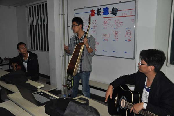 晚9点整,伴随着吉他组成员热烈的掌声,培训会正式拉开帷幕。首先赵伟伟讲述了吉他的起源及其发展历史,并且拿出自己的吉他耐心的向组员们讲解吉他的构造和发声原理。随后,赵伟伟鼓励组员们勇敢的进行尝试,通过弹奏一些简单的音符来熟悉各自的琴,并针对组员实践中犯下的错误进行了一系列的讲解和操作演示,场面十分热烈,组员们全神贯注的听讲解,做笔记的同时并积极提问。最后,赵伟伟对本次培训作了简短的总结,并殷切的鼓励组员们在今后的练习中可以克服困难,争取早日完成训练目标。