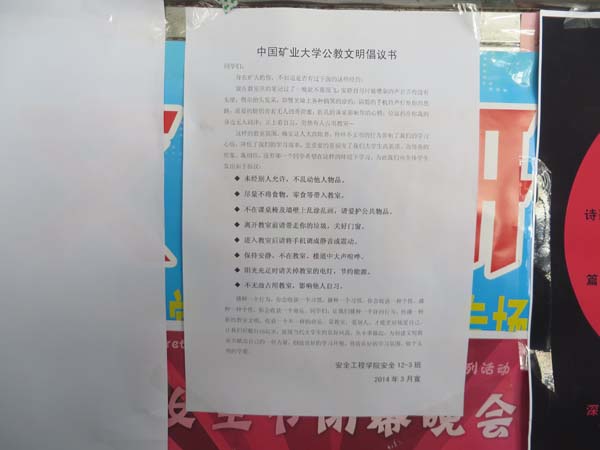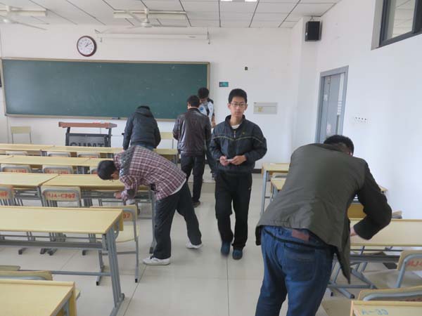 12-3班部分同学在班长彭扬的带领下来到教四。他们首先在大厅的公告栏上张贴提前准备好的倡议书,倡议书的主要内容是建议同学们遵守自习室的秩序,用自身的行动带动他人创造更好的自习环境。随后,他们按照之前分好的小组对教四的部分教室进行了认真仔细的打扫,他们又对课桌和讲台进行了整理,在一阵忙绿过后,教室变得干净、整洁。他们的劳动也得到了自习室同学们的赞许,班长彭扬表示,很开心能够尽自己的一份力量为同学们营造一个干净、优美的学习环境,这样的活动很有实际意义。