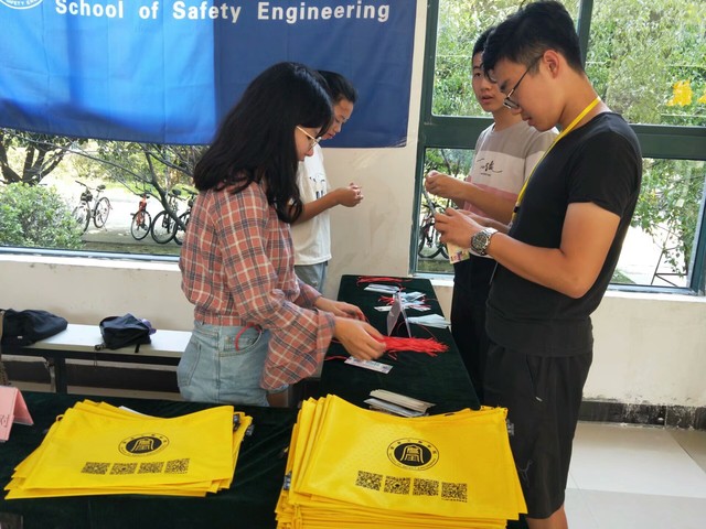 上午8:30,搭建迎新会场的工作就开始了。志愿者们先将新生们的卧具一套套从货车上卸下来,再搬到梅三一楼的储物室。接着,志愿者们兵分三路,一批在梅三楼和竹一楼悬挂迎新横幅,一批在梅三大厅右侧平台布置一站式服务的绿色通道,还有一批在三食堂广场搭建迎新帐篷。大家工作井然有序,在中午前完成了初步搭建工作。