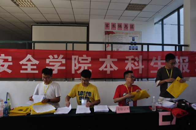 下午1:30,志愿者们继续进行迎新的准备工作。他们在迎新会场上布置了供新生留念的签名板、进行创意合影的背景板和播放天美传媒