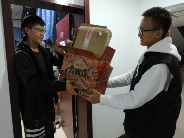 晚上九点三十分,志愿者们在梅三楼下集合完毕。在负责人的安排下志愿者们分组前往不同宿舍。青年志愿者们通过走访宿舍的方式进行活动宣传和快递包装盒的回收,他们先向同学们介绍活动目的,然后再寻问同学们是否有空余的快递盒后进行回收。活动过程中可以发现,双十一后,每栋寝室楼门口的垃圾桶旁都堆放着很多废弃的快递纸盒,既造成了纸盒的浪费,也对宿舍楼的卫生环境维持造成影响。同学们都积极参与此次活动,不仅细心地清空纸盒里杂物后再递给志愿者们,更有同学主动将整理好的纸盒堆放在统一收集纸盒的地方。