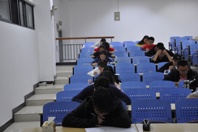 本次考试共分设博1C-203、博1-C204、博1-C303三个考场。考试开始前,各班班委组织同学们将书包、手机等物品置于讲台,并按照事先安排好的座位就坐。晚上七点整,监考人员开始分发试卷。考试开始后,考场上秩序井然,纪律严明,同学们皆安静而紧张地伏案作答。每隔上一段时间,学习部的监考人员便会提醒一下在座的同学们考试剩余时间,以便同学们能够合理地安排考试时间,不慌不乱,从容作答,更好地发挥出自己全部的实力。考试期间,辅导员吕鑫在各个教室进行巡考,关注同学们的答题情况,并重点留意了那些举笔不定的同学。八点五十分,考试结束,监考人员有序地将试卷收回,模拟考试正式结束。据悉,此次A1模拟试卷是由学习部成员编排印出,考试后仍会由学习部成员将试卷批改出来。