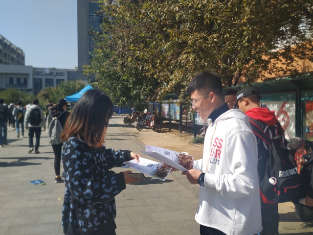 中午12时准,志愿者们准时来到三食堂门口开始宣传。据悉,此次“求学路,故乡情”活动要求参与活动的同学以ppt的形式上交一份介绍自己家乡的作品,向大家介绍自己家乡的美食、美景与文化。以期达到新生相互认识,拉进彼此距离的目的。志愿者们井然有序地开展活动,积极宣传本次活动。尽管正值中午吃饭的时间,但志愿者们毫不在意。他们忍受着饥饿,在阳光下拿着传单,一遍又一遍耐心地向路过的同学宣传活动的内容,以求更多人可以了解并参加到这个活动中来。从人来人往的高峰期一直到所有人吃完离去,志愿者们一直面带微笑,尽职尽责。