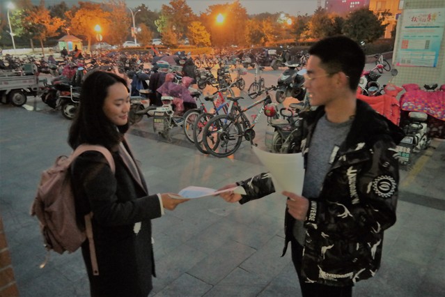 下午五点,知行社成员们早已来到了三食堂广场搭起了帐篷,为宣传活动做起了准备。随后,成员们积极地向同学们分发了理论读书月的宣传单,并详细介绍了活动内容、活动时间、活动形式等,号召同学们积极报名参赛。知行社成员们的热情宣传使理论读书月活动得到了更多人的关注,现场气氛积极活跃。在大家的共同努力下,许多同学填写了报名表格,部分同学也通过网络报名的方式参加此次比赛。