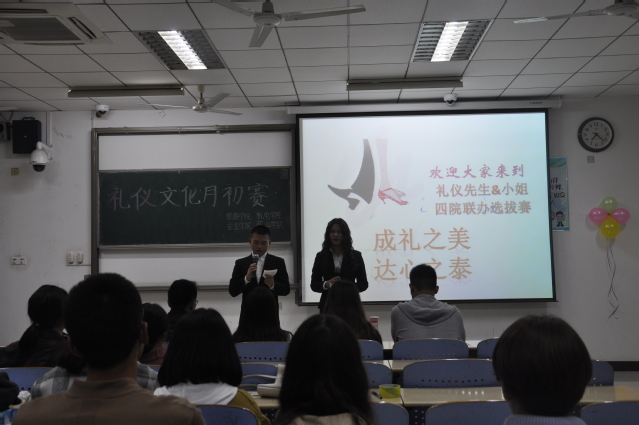 本次比赛分为三个环节,第一个环节是由各位参赛选手进行T台走秀。在明快的音乐映衬下,选手们纷纷登场亮相。男生们英俊潇洒、风度翩翩,女生们貌美靓丽、举止高雅,赛场顿时散溢着青春与活跃的气息。随后,便是知识竞答环节。选手们在银幕前一字排开,对着银幕上出现的问题进行细致的分析和激烈的抢答。在这个环节,大家不仅展现出了自己的礼仪文化底蕴,也学到了很多之前所不了解的礼仪知识。最后,各位参赛选手给大家带来了精彩的才艺展示。有婀娜的新疆舞,有妙美的歌曲,有动人的朗诵,也有别具新意的哑剧表演。同学们充分的展示着自己的才华,将赛场的氛围推向了高潮。在一片欢声笑语中,礼仪先生小姐选拔出赛落下了帷幕,而礼仪文化知识却永远回荡在心间。