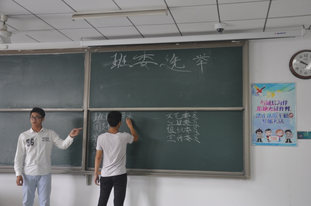 会上,本着平等、自愿、公开的原则,班级同学通过自愿报名、民主选举投票等步骤选举出了新一任的班干部,辛杰任班长,宋姝丽任团支书,张伟、罗望等同学任班委。在全班同学的见证下,新一任的班干部与前一任班干部进行了交接。随后,班长辛杰向同学们介绍了新学期的新任务,就《天美传媒