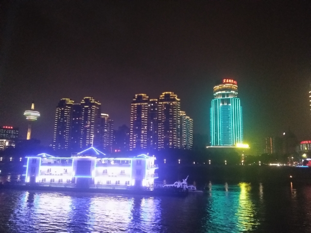 晚上七点半,团队成员抵达宜昌万达游客中心,乘坐五星级游轮游览宜昌沿江风景。据悉,“交运长江夜游”产品是宜昌交运集团打造的宜昌首款夜游产品。游客在三峡游客中心乘坐长江三峡8号游轮,下行至宜万铁路大桥调头,上行经天然塔、夷陵长江大桥、磨基山、镇江阁、至喜长江大桥,经过葛洲坝船闸,在黄柏河码头停靠。游客离船登岸,乘坐旅游大巴返回三峡游客中心,结束行程。长江三峡8号游轮为全通透的船体,在船上不同楼层,各个角落都能体验到长江的夜景。通透的船体如一艘水晶船行驶在江中,与岸上的灯光交相辉映。游船行驶十分平稳,感觉如同在陆地上行走般。