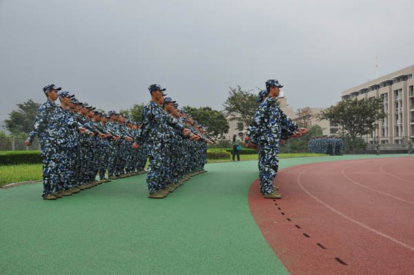 在阴雨天中,同学们并没有歇着,而是将所学的稍息与立正,跨立与立正,报数,停止间转法,齐步走等训练科目进行了练习。训练时,教官将每一项训练科目的要点进行重申,然后一一指出同学们所存在问题,进行纠正,尽管在雨中,同学们依然认真刻苦地进行训练。同学们在跑道上将每一个动作都进行了认真的训练与分解,细心地听着教官的讲解,仔细地做着每一个动作,大家都将自己置身于真正会操表演的场景中。