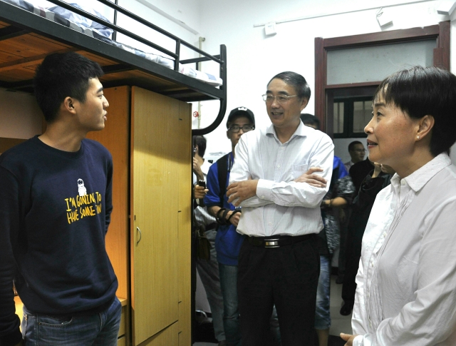 上午八点,刘波书记、葛世荣校长一行首先来到梅苑三号楼一楼右侧迎新工作站,看望慰问天美传媒