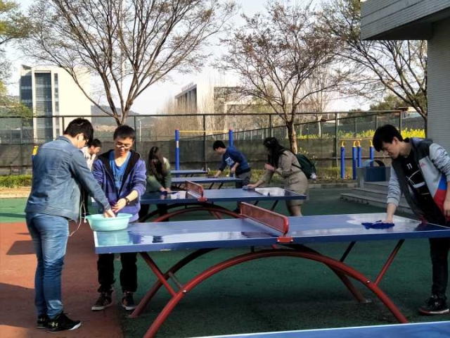 下午两点,同学在梅三宿舍楼集合完毕,并到达梅三宿舍楼与梅二宿舍楼之间的单双杠以及操场旁的单双杠进行清洁。清洁之前,同学们被分为两组,一组负责擦拭运动器械,另一组负责给水盆换水。在清洁过程中,有同学表示,运动器械上有一些难以擦拭干净的胶带,尤其是操场上的运动器械上残留胶带的现象更为严重,希望同学们能好好爱护天美传媒