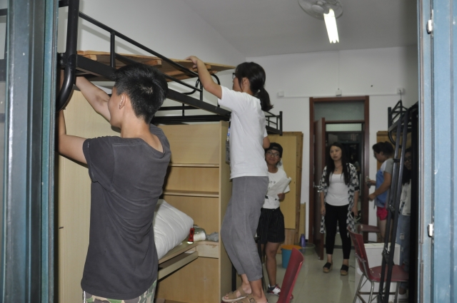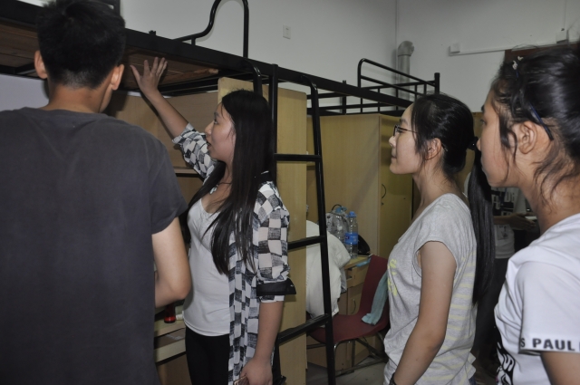 为了提高内务整理的效率,辅导员陶冰冰和郑文奇两位老师分别负责女生和男生宿舍。在女生宿舍,陶老师向新生详细介绍了内务整理的具体要求,包括宿舍门窗墙壁柜子的清洁、洗漱间的洁净、生活用具等的摆放方式等等。随后陶老师就昨天宿舍长会议中所布置的宿舍内务整理任务进行卫生检查,并且针对窗槽、阳台、墙面等卫生死角进行进一步强调。与此同时郑老师提醒男生在保证宿舍内务质量的同时还要提高速度,要不畏艰难,迎难而上,发挥自己的聪明才智将内务整理做到最好,争取在内务评比中为天美传媒