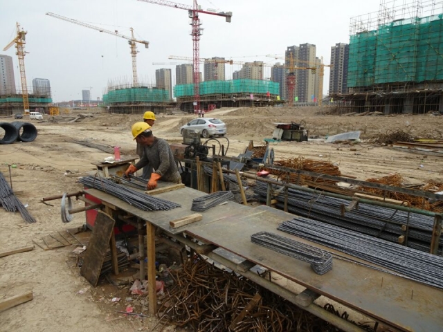 早上7点半,团队成员带着黄色安全帽,身穿实践服,首先在工头的带领下,来到了建筑工地A区的三号楼,三号楼是建造不久的建筑,目前工作进度在第四层,团员们爬上由木条组成的简易楼梯登上二楼,绕过很多施工建材最终登顶楼,楼顶的施工人员很多,都是非常的忙碌,我们很难找到机会与他们聊聊天。太阳早早的便升起,这对于我们未入社会的大学生来说很不适应这种环境,但是我们看到工人们似乎对这样的天气毫不在意,依旧不知疲倦的忙碌,我们首先找到了一位焊接工人,我们了解到,在这片工地上,焊接工属于比较轻松的工种,因为并不是每天都需要焊接,所以他们的休息时间比较多。据这位工人叔叔说,他们一天大概能焊接1200条钢筋,这也是工地下达的目标。“我们在这种天气下作业都比较认真,往往一个上午就可以干完,下午就可以不必忍受这种太阳。”这位焊接工人笑着说,他们每焊接1条便可以得到工资1元,平均每天400块钱工资。