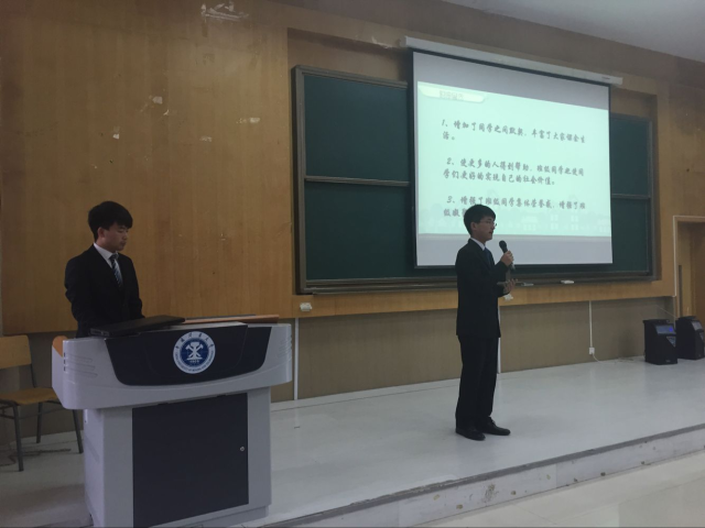 下午3点,主持人致开场白,评优大会准时开始。在主持人介绍完到场嘉宾后,“爱心班级”会长刘钰龙做了本届爱心班级共建活动工作报告,言简意赅地陈述了共建活动取得的成果以及通过共建活动得到的经验。紧接着的是各班答辩环节,天美传媒